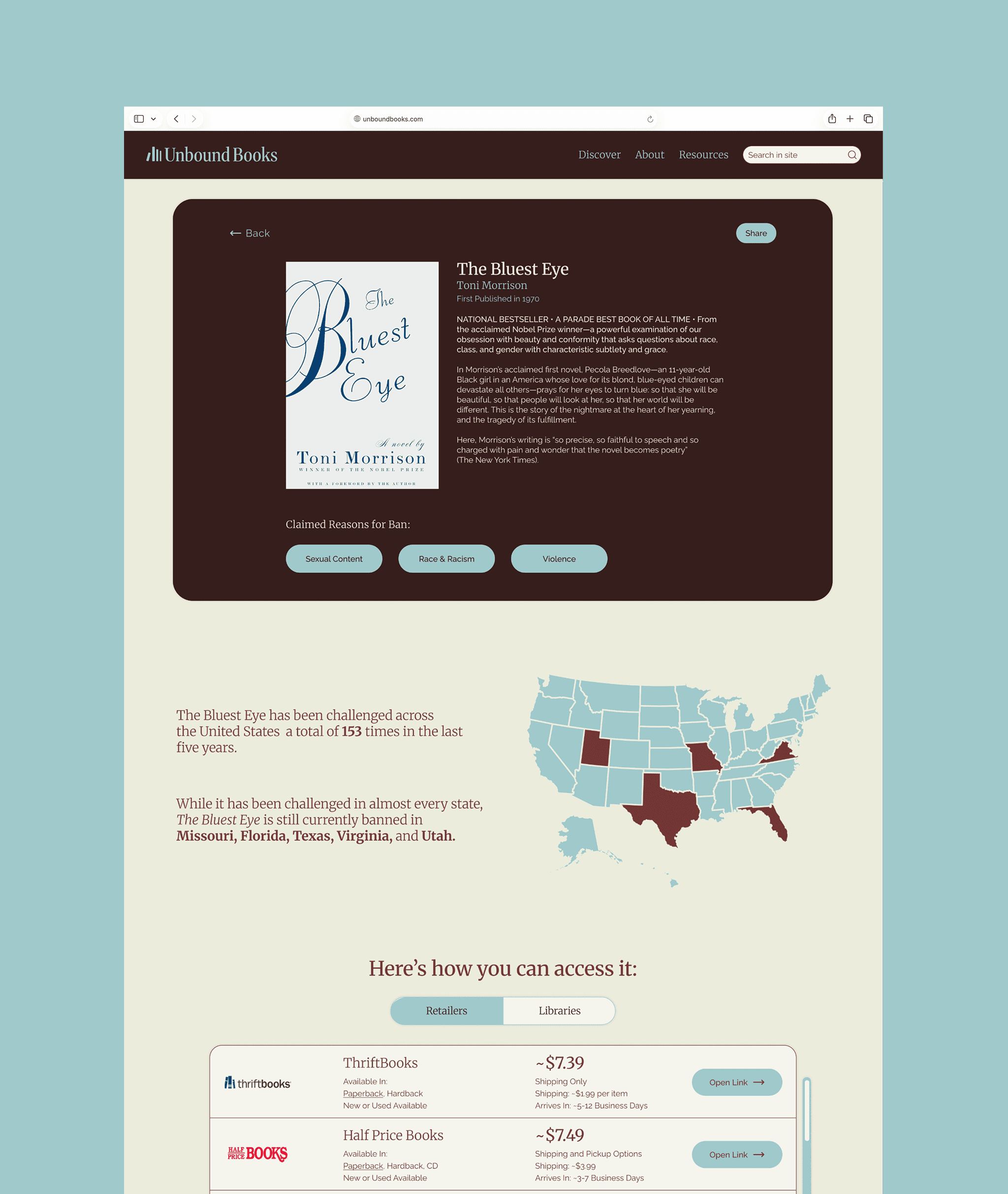 Unbound Books is a digital platform that helps users explore banned or challenged books, understand where and why they are restricted, and find accessible ways to read them.